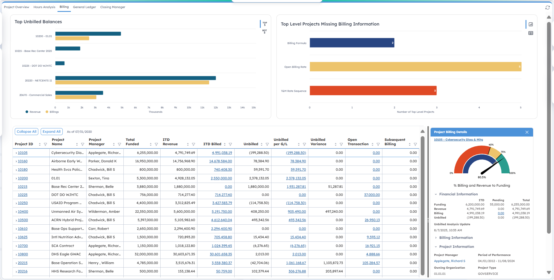 The Billing tab helps you monitor unbilled balances, identify billing setup issues, and assess project financial performance in real time.