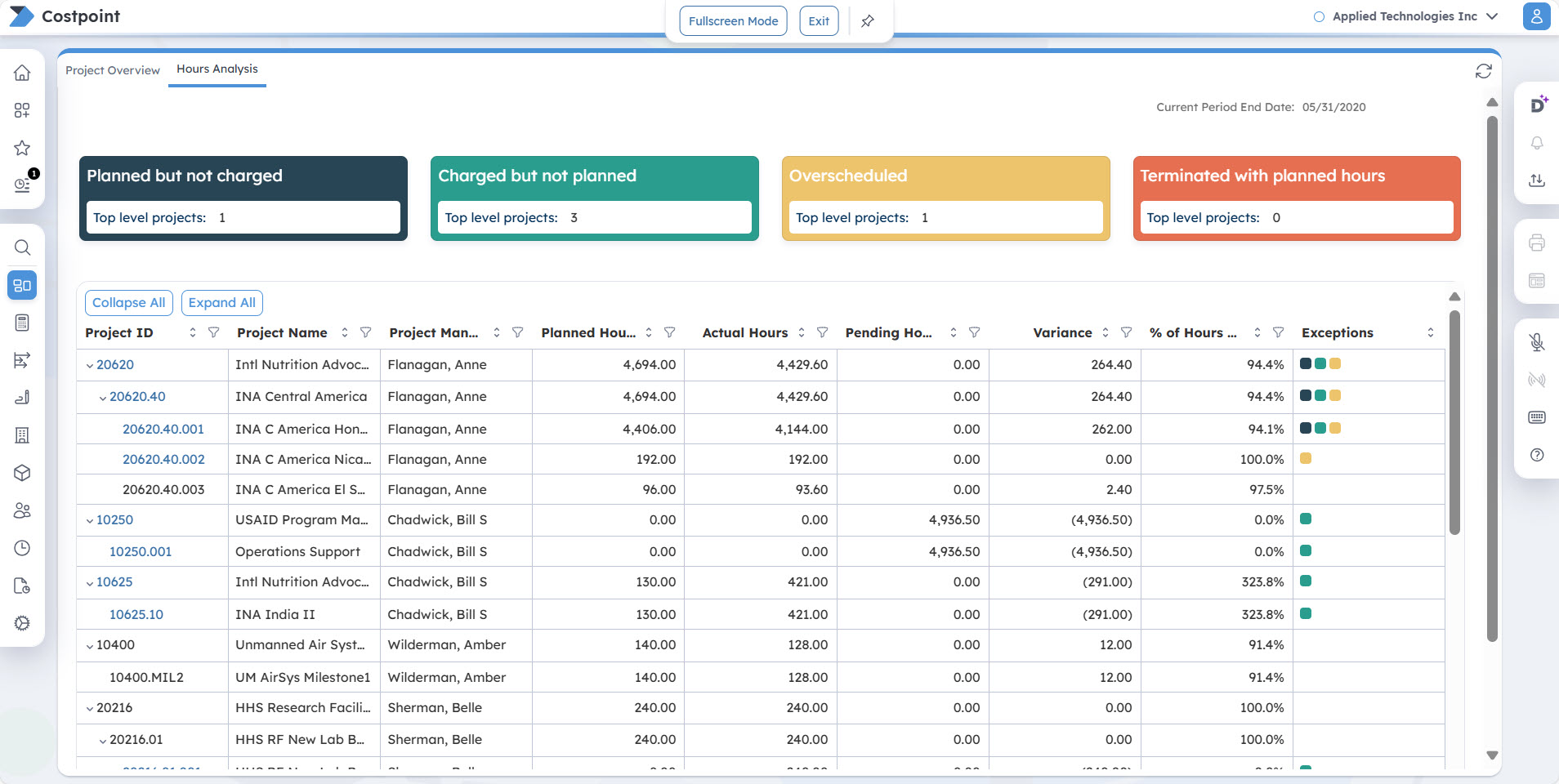 When you click the Project ID on the hours analysis table, it drills down into the Project Resources Exceptions report.