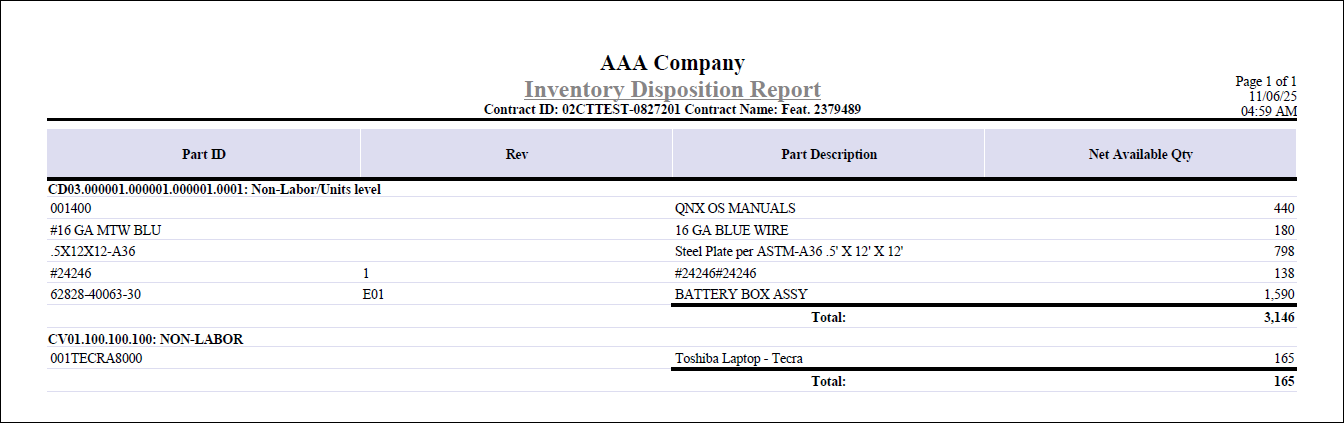 Here is an example of the Inventory Disposition Report generated from the Manage Contracts screen.