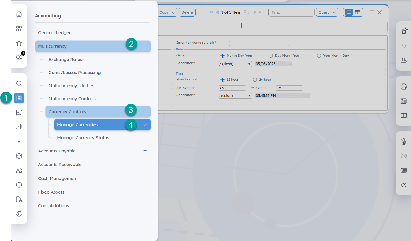 - Select an application. Applications are the lowest level of the hierarchy. Select an application to open it. In this example, the Manage Currencies application is selected. You can select the star next to the application name to add it to the customizable My Menu for quick access.