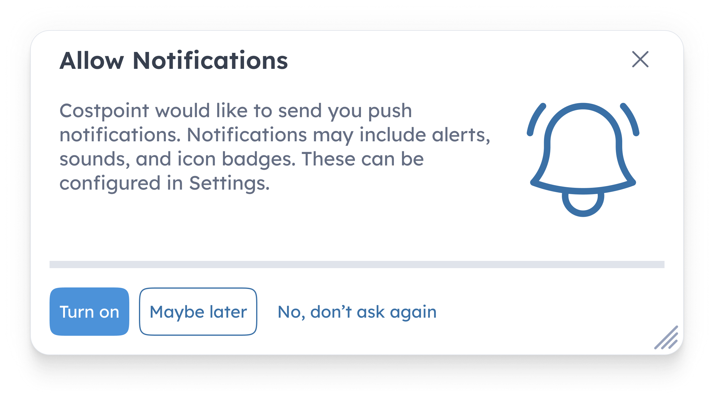 Choose whether to allow Costpoint to send you notifications about timesheets, workflows, administrative messages, the job server, and single-user processes via email (including interactive emails), text message (SMS), and device notifications. You can select a preferred notification method for each type of notification in Costpoint. These preferences can be set at the company, user, and application level.