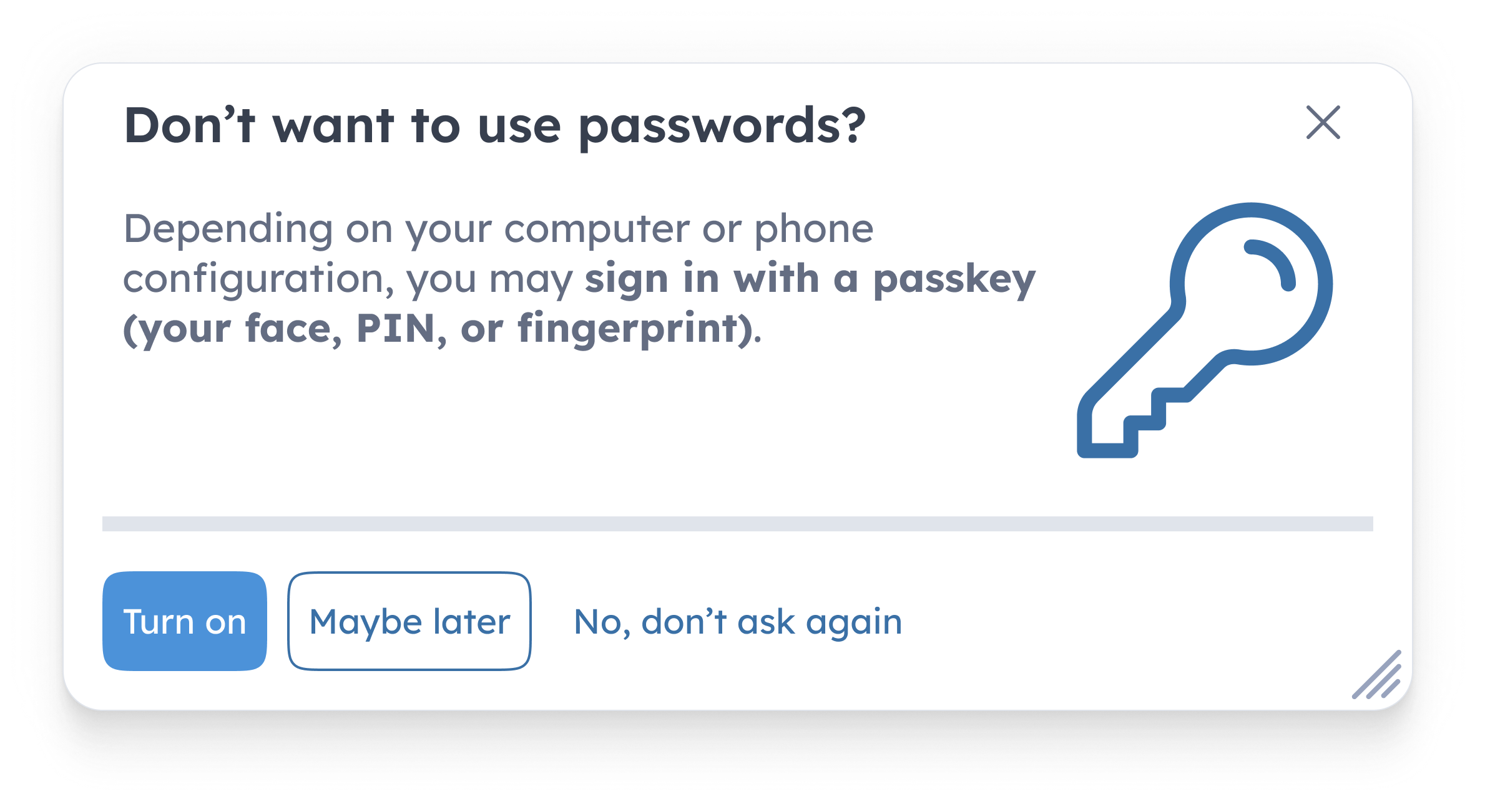 When you log in with a password, Costpoint invites you to sign in with a passkey instead of your password. You can create a passkey to start signing in with just your fingerprint, face, or screen lock. You can also use another device, like a phone or hardware security key.
