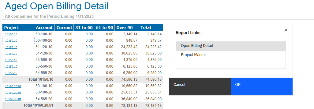In the Aged Open Billing Detail, click a project to drill through to the Open Billing Detail or Project Master report.