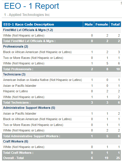Sample Report The following sample shows the EEO-1 Worksheet report. Parent Topic: EEO-1 Report HomeReports & AnalyticsWelcome to Costpoint Business IntelligenceHuman ResourcesHuman Resources ReportsEEO-1 ReportSample Report