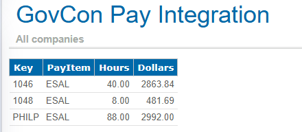 Sample Report The GovCon Pay Integration report exports timesheets for integration with GovCon Pay. Parent Topic: GovCon Pay Integration HomeReports & AnalyticsWelcome to Costpoint Business IntelligenceOverviewLaborLabor ReportsGovCon Pay IntegrationSample Report