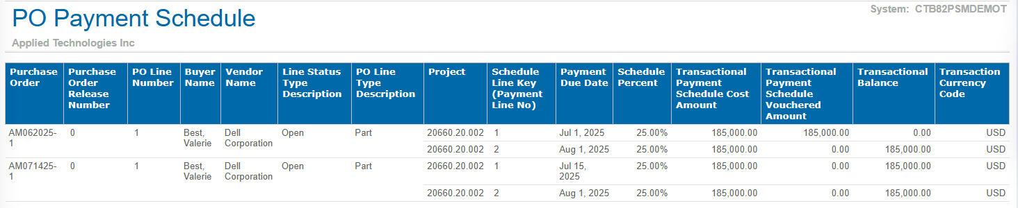 The PO Payment Schedule lists all PO lines with payment schedules.